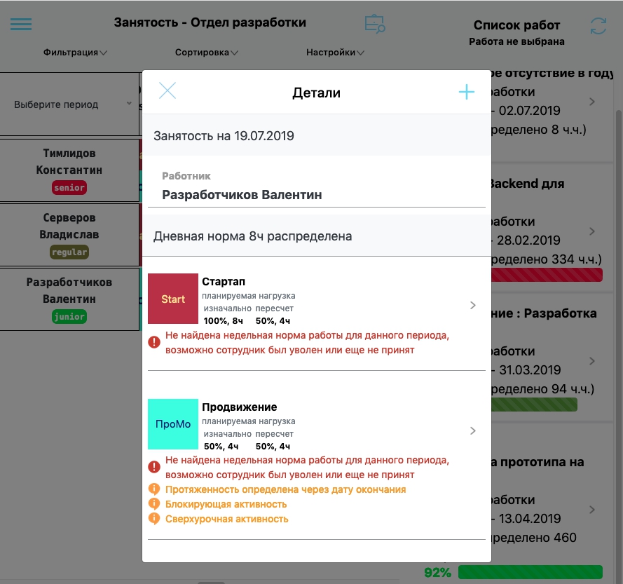 При этом процент занятости является соотношением того сколько сверх-часов будет выработано в день относительно его дневной нормы.