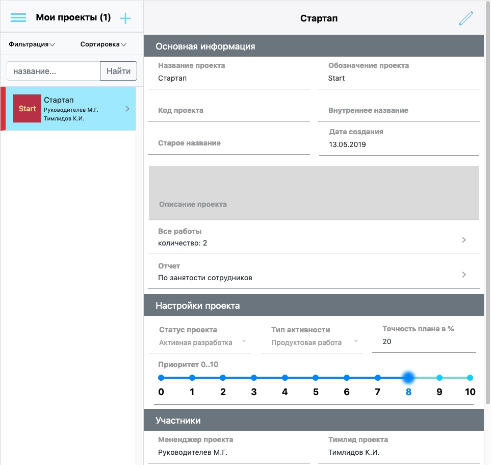 Код проекта и точность плана служат для формирования планового отчета по месяцам. Код нужен для связки с системой учета сотрудников.